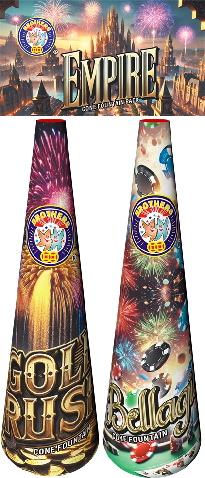 A crackin’ pack of two conical fountains “Gold Rush” and “Bellagio” each with it’s own unique effect but both reaching fantastic heights. Gold Rush as the name suggests produces a red flame, gold glitter thrusts itself skyward with ever greater force gaining height as time progresses. Bellagio produces a plume of silver sparks with a slight crackling effect reaching before errupting into a fierce titanium crackle with red and green stars. Whilst technically low noise as there are no bangs, the crackle in Bellagio is quite fierce.